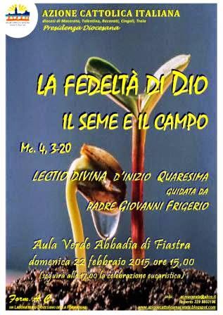 Per non perdere la bussola di questo percorso, l’Azione Cattolica diocesana invita all’ascolto della Parola di Dio domenica 22 febbraio alle ore 15.00, presso la Sala verde dell’Abbadia di Fiastra (scarica il volantino), attraverso una lectio divina guidata da p. Giovanni Frigerio, che continuerà la riflessione sul seme e sul seminatore iniziata con l’incontro dello scorso novembre. Brano, quello del seminatore, scelto dall’Azione Cattolica come icona biblica di riferimento per il triennio 2014-2017. Nelle linee guida si evidenzia come “la cura dell’interiorità, essenziale in ogni stagione della vita, è il cammino personale verso la santità e costituisce la radice di una vera corresponsabilità e la via per essere persone nuove in Cristo Gesù. Alimentare la nostra vita spirituale, per riuscire a coniugare tutte le dimensioni della persona, spalanca il nostro sguardo attento e amorevole sul mondo” (dagli Orientamenti per il triennio 2014-2017).